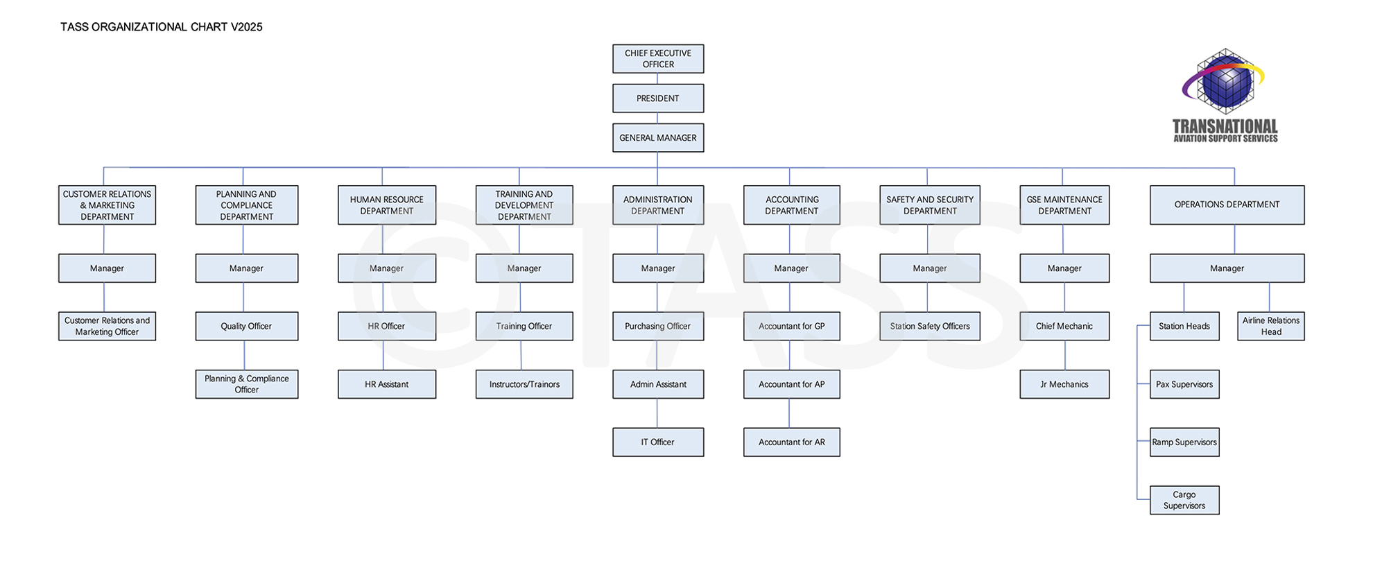 Transnational Aviation Support Services, Inc. (TASS), a wholly-owned subsidiary of the Transnational Diversified Corporation (TDG), offers a comprehensive range of aviation services strategically positioned at all major international gateways and serving 14 airports throughout the Philippines.